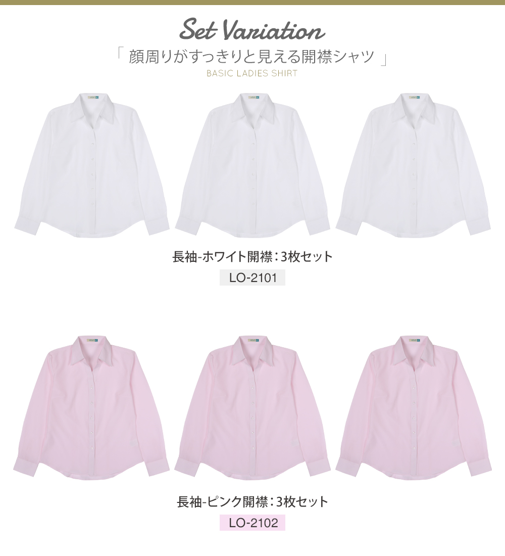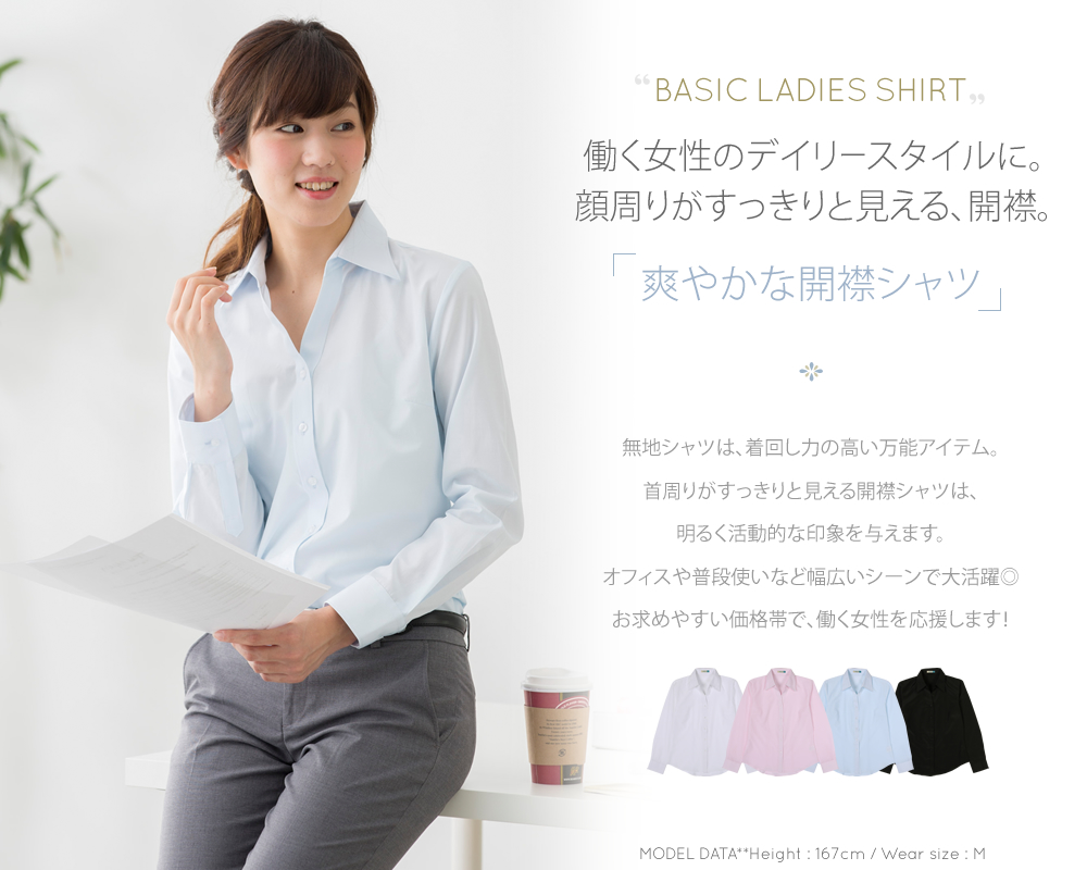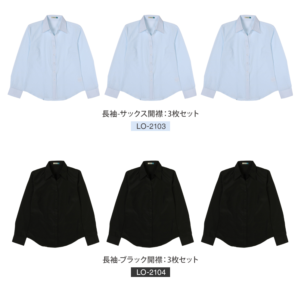 | 特徴 | ■レギュラータイプ 首元の第一ボタンがある、レギュラータイプのブラウス。 定番デザインなので、使いやすく幅広いシーンでお使い大活躍。 ■開襟タイプ 首元の第一ボタンのない、開襟タイプのブラウス。 締め付けがなく、顔周りがすっきりと見えるのが特徴です。 |