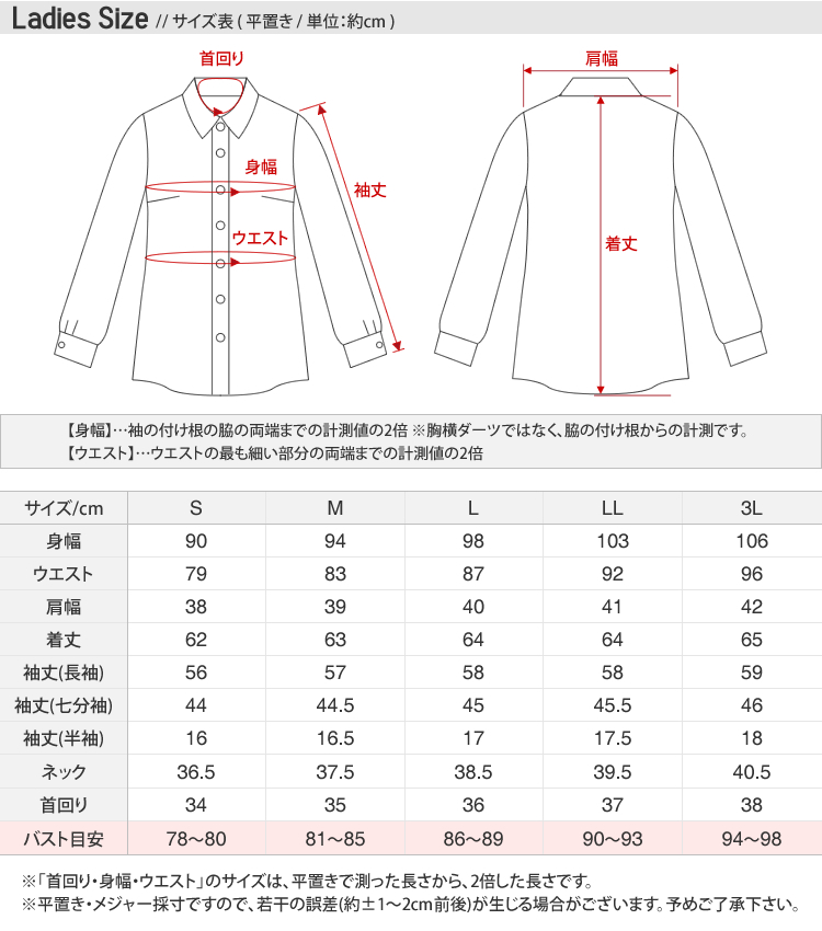 | サイズ | S / M / L / LL / 3L ※本商品はタイトな作りのブラウスです。ご購入の前に必ずサイズ表をご確認ください。 |